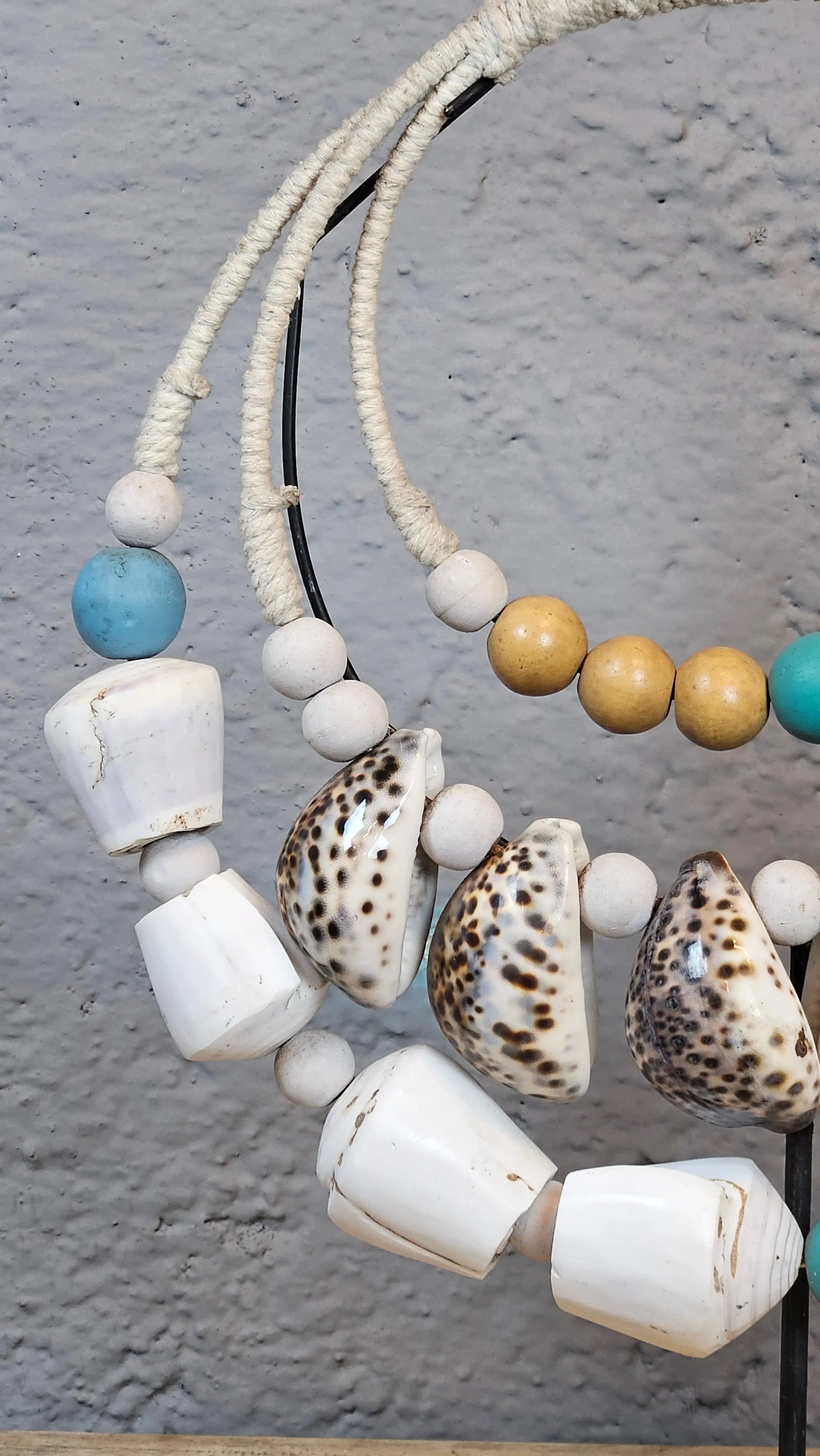 Découvrez ce collier décoratif exceptionnel composé de véritables coquillages naturels, perles en bois et éléments blancs, magnifiquement présenté sur son support. Cette pièce unique allie l'art tribal aux influences marines pour créer un objet de décoration à la fois ethnique et raffiné.